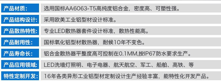 產(chǎn)品耐用性:國標(biāo)氧化鋁型材散熱器,耐候10年不變色。